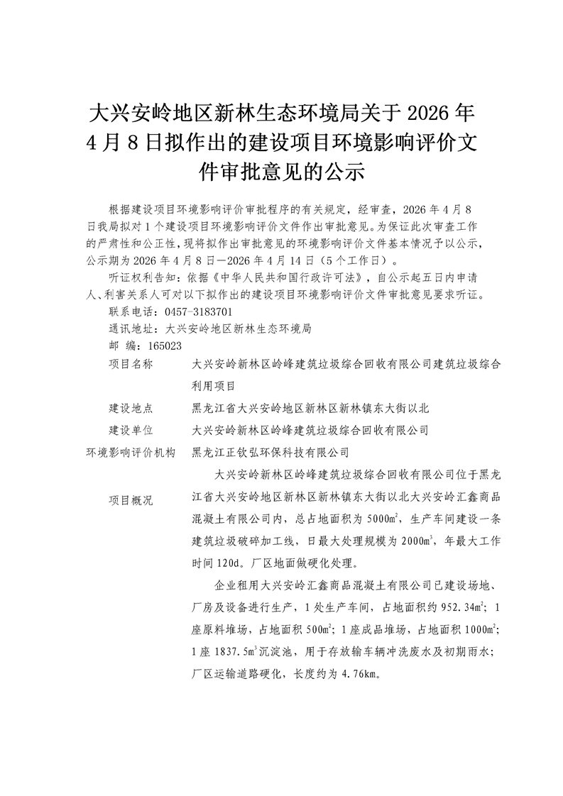 大兴安岭地区新林生态环境局关于2026年4月8日拟作出的建设项目环境影响评价文件审批意见的公示
