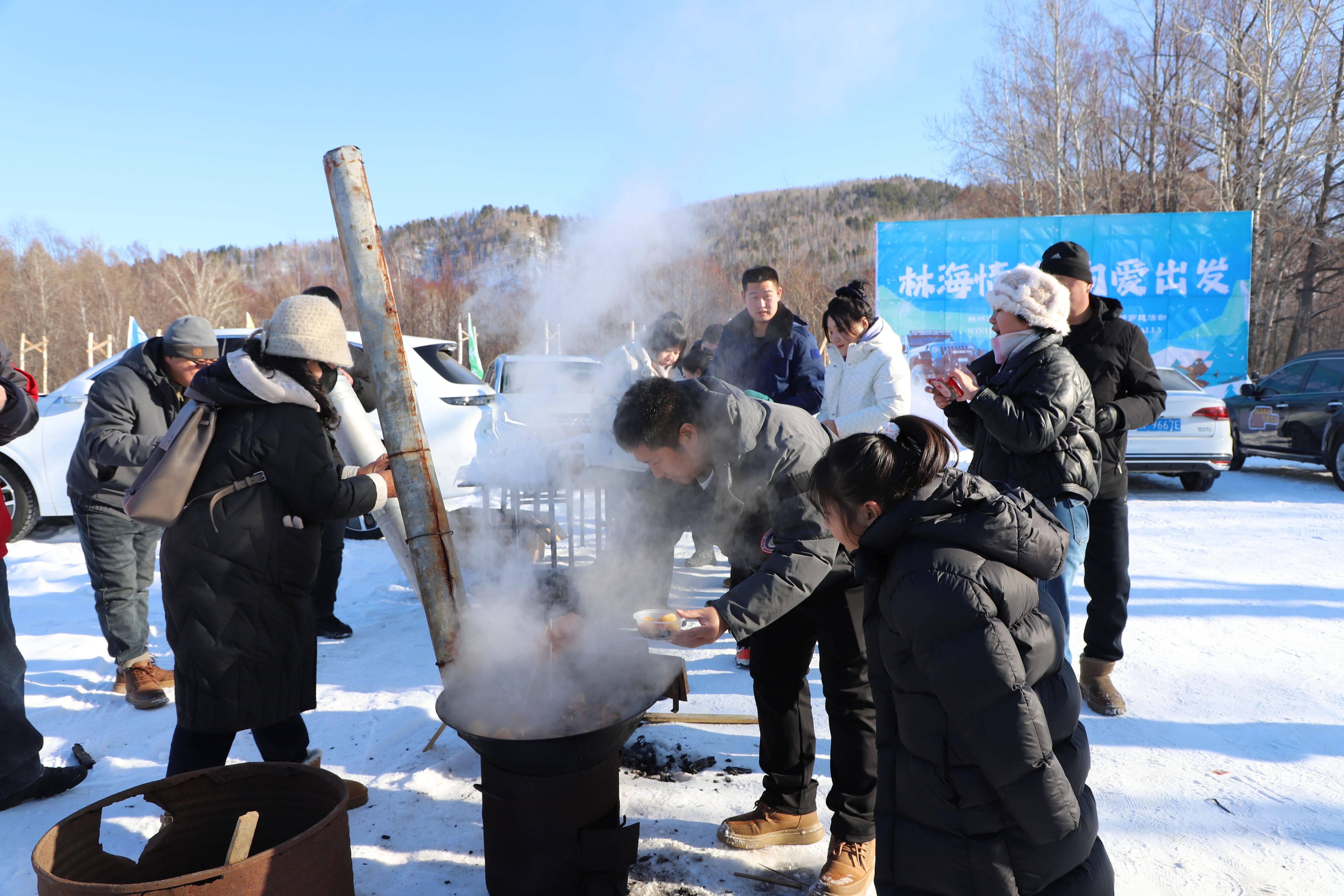 穿越体验结束后,热气腾腾的特色铁锅炖暖心上演,大家围在一起欢声笑语,在林海之间感受小年团圆气息,在冰雪之上共享运动快乐。