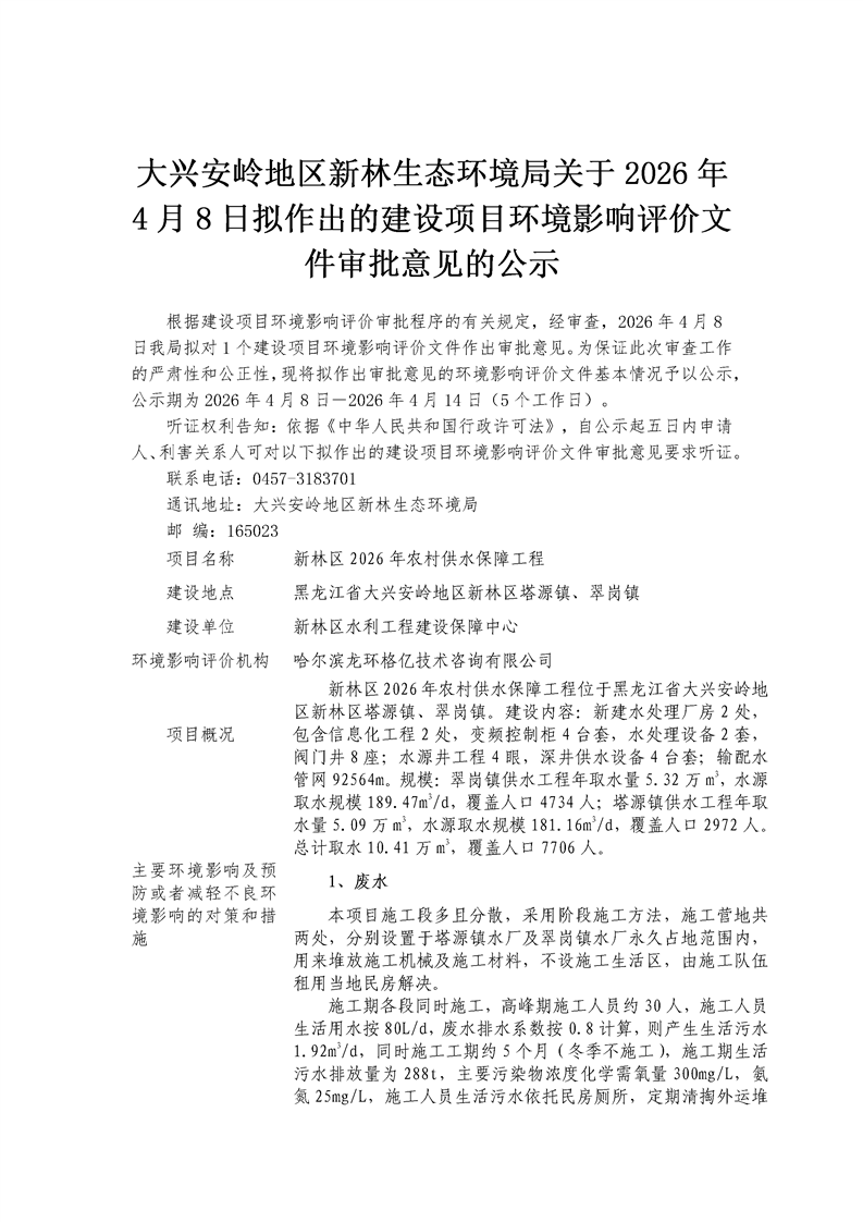 大兴安岭地区新林生态环境局关于2026年4月8日拟作出的建设项目环境影响评价文件审批意见的公示