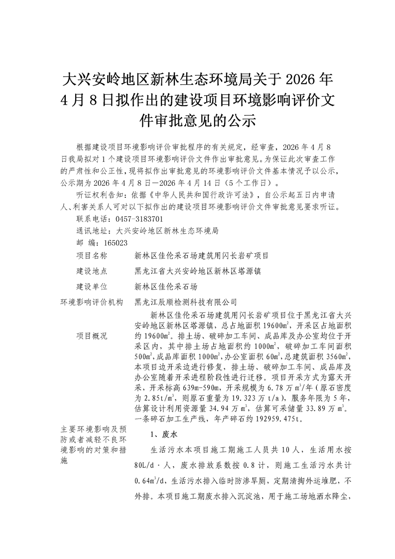 大兴安岭地区新林生态环境局关于2026年4月8日拟作出的建设项目环境影响评价文件审批意见的公示